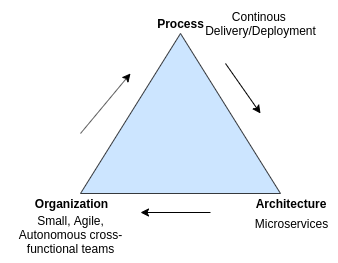 The microservices architecture enables the organization to have small teams working on a service. Jeff Bezos' two-pizza rule recommends having smaller teams for increased productivity and getting work done effectively.