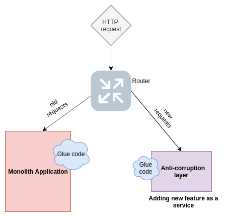 This service is not completely isolated from the monolith and shares some glue code with the original application. The service is sometimes also called the Anti-corruption layer; it has its domain model and does not get corrupted with the old monolith code.