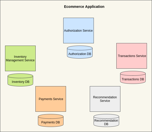 As seen in the above image, an e-commerce application has different services like authorization, inventory management, transactions, payments, and recommendation.
