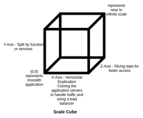 The X-axis represents horizontal scaling. When the load on a monolith application increases, we increase the number of application servers to handle the traffic. It simply means deploying the application on N servers so that each of the servers now handles 1/Nth of the traffic (Possibly!).