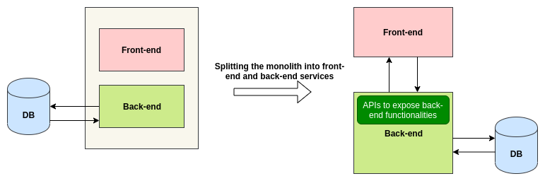 This technique will help us in scaling both these components independently as per the need. But it does not solve the original problem of splitting the monolith into different services. The front-end and the back-end services might grow to the point to become big monoliths.